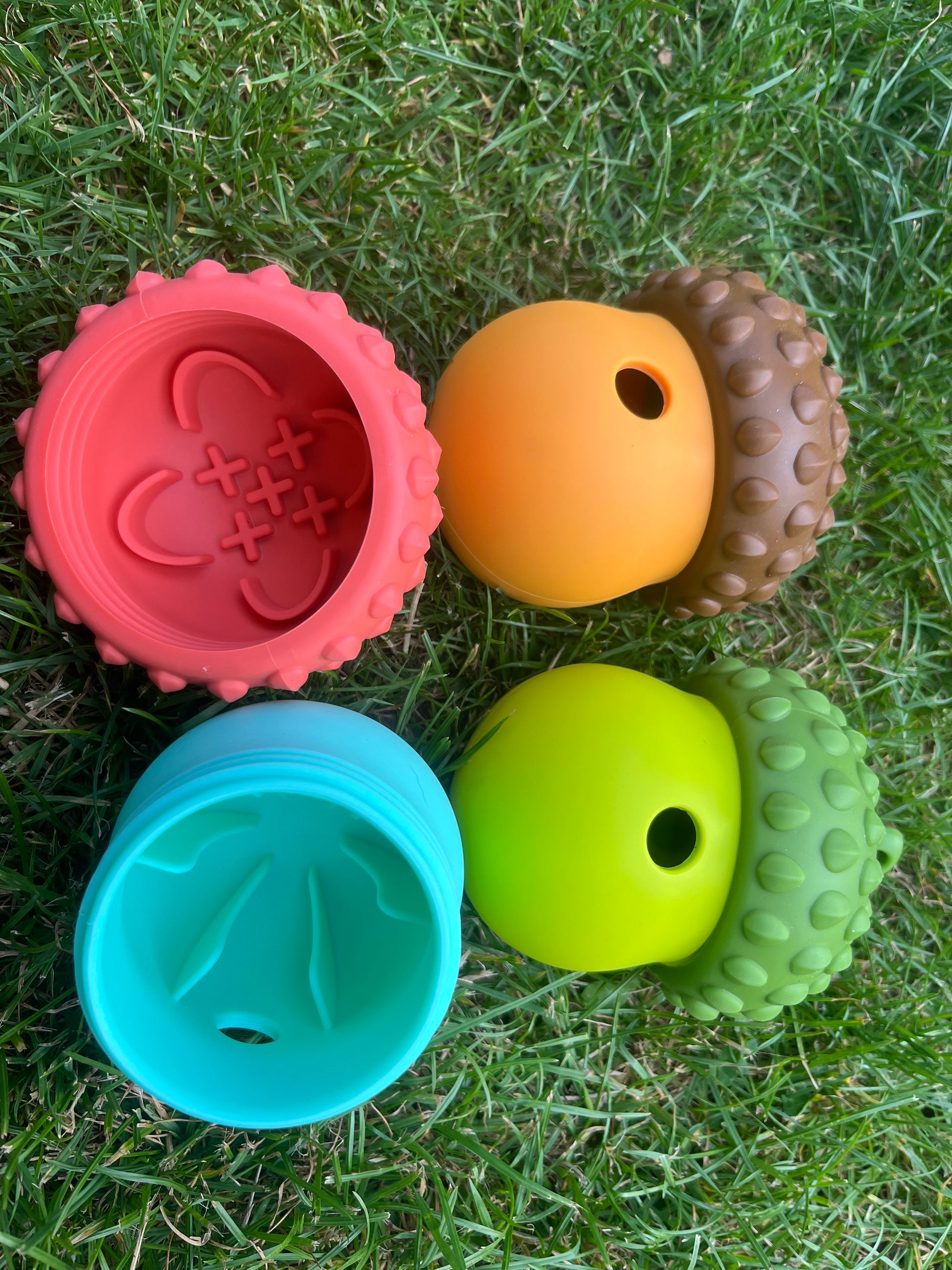 Pop treats inside and let your dog roll it around to retrieve them. These also double up as lick pits. Fill with banana/peanut butter/cream cheese etc for the ultimate enrichment experience. These can also be used in the freezer. They are dishwasher safe too. I just love them can you tell 😁