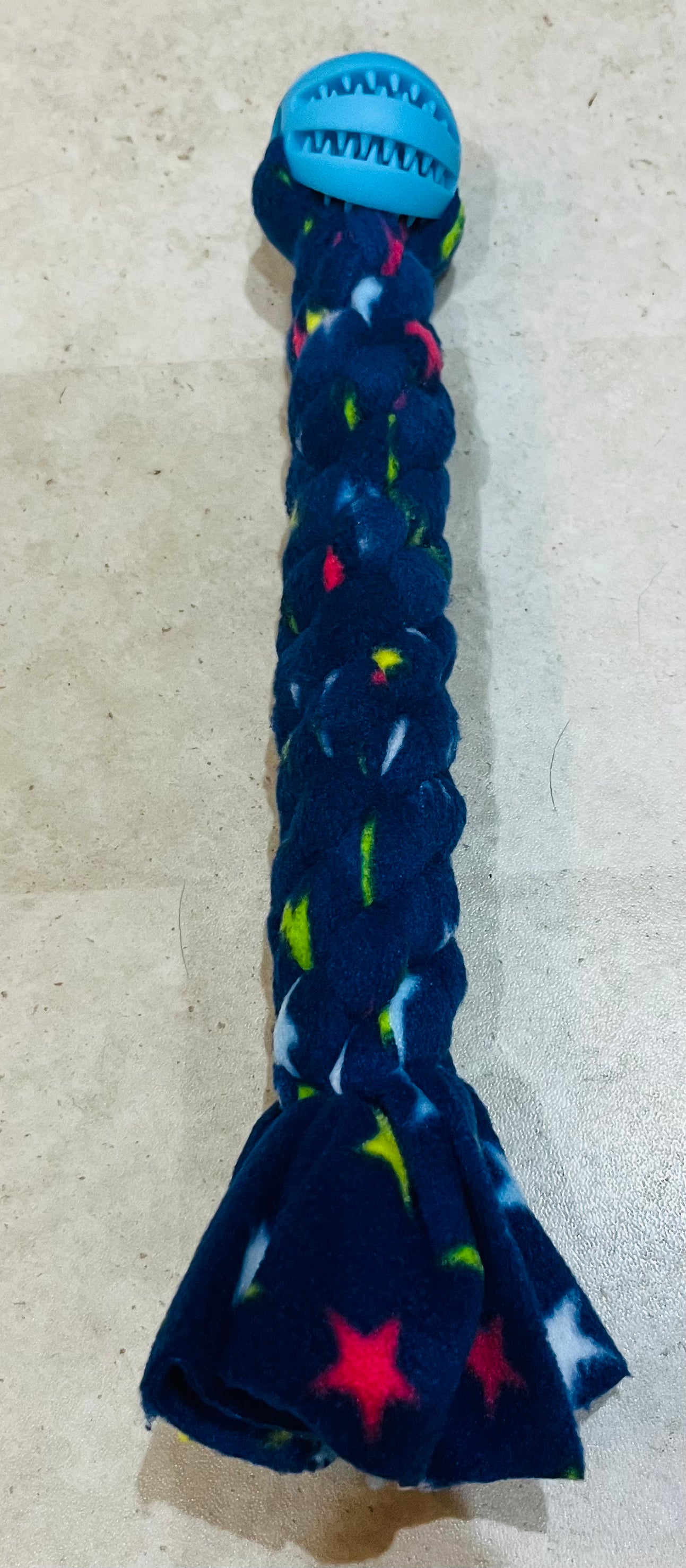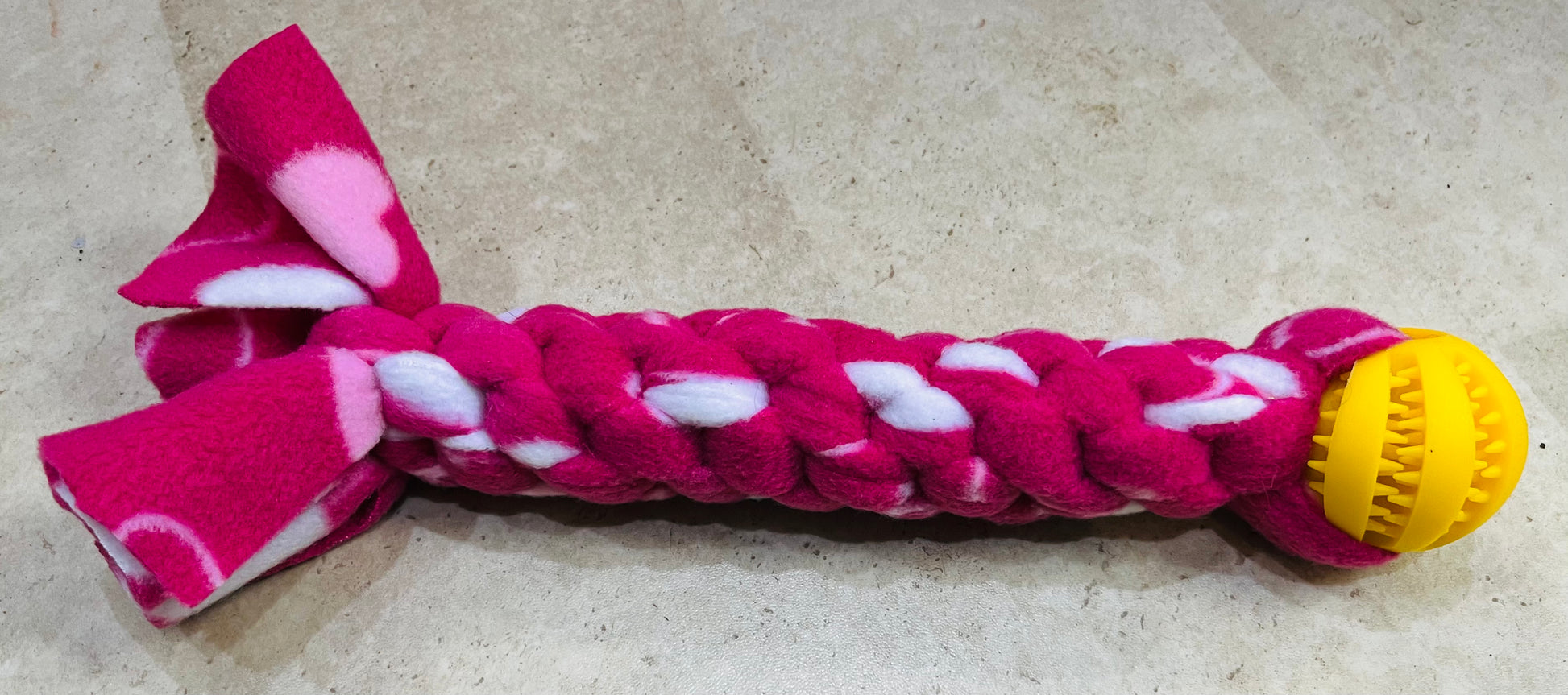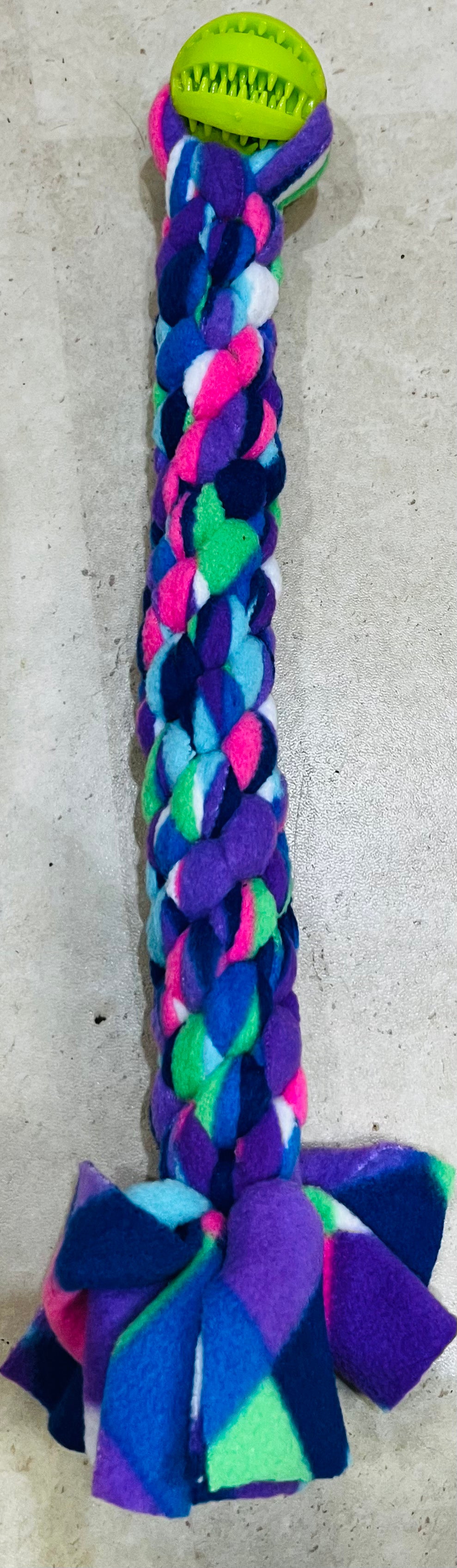 Ball & Tug - Approx 30cm in length . These are square knotted so are very robust and are finished with a treat dispensing ball. Ball colour will vary but it will compliment the fleece design.Â