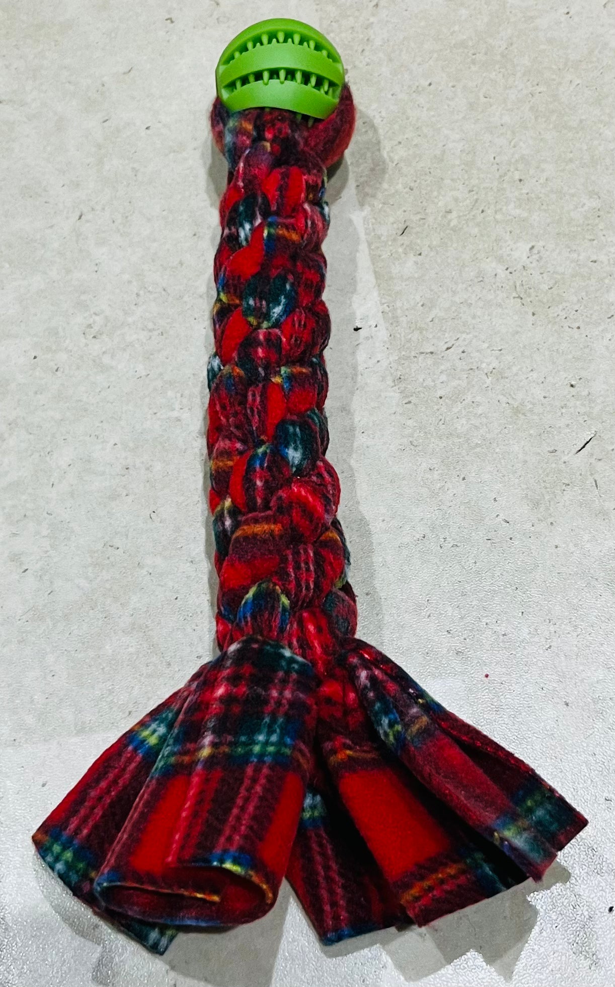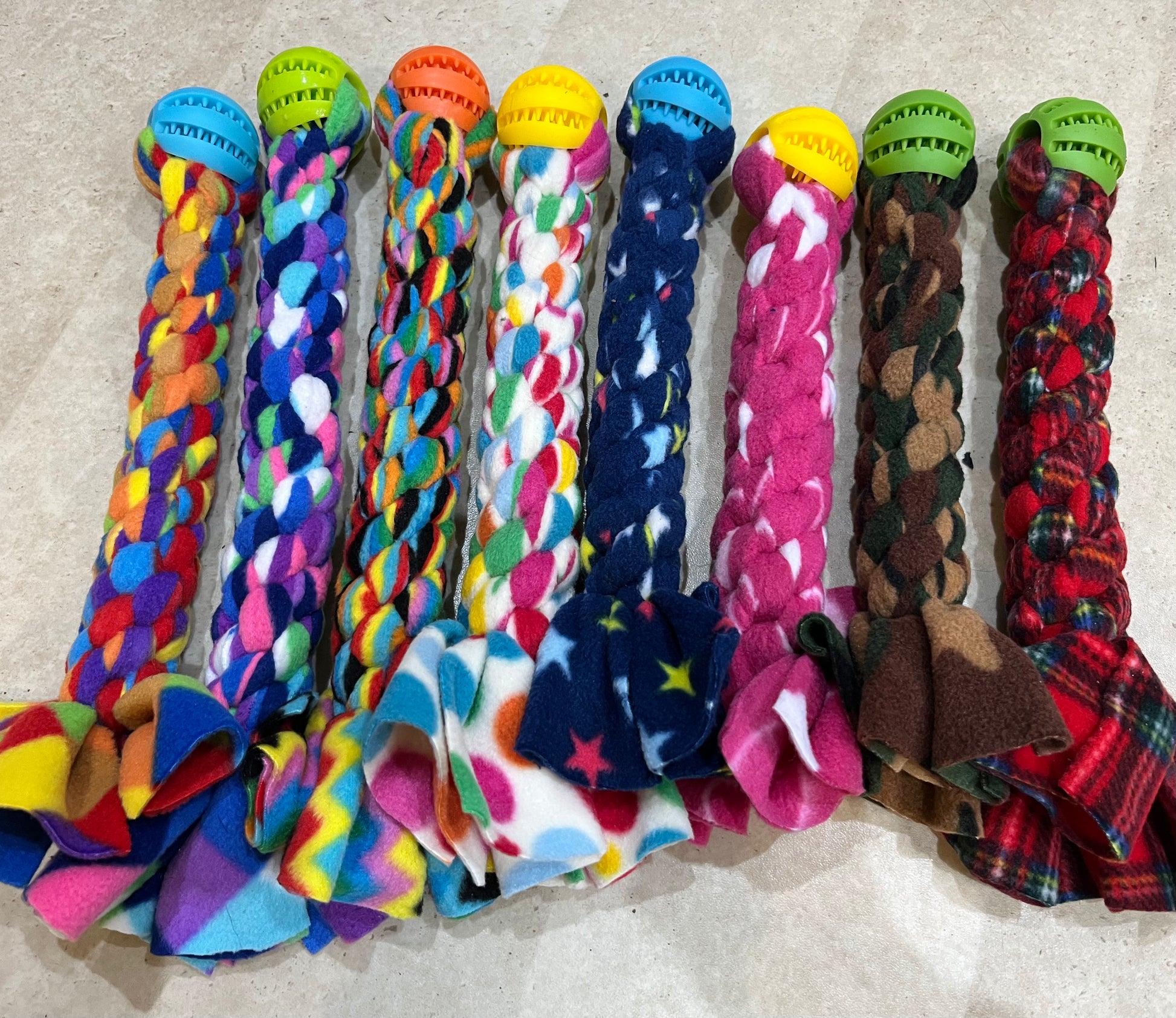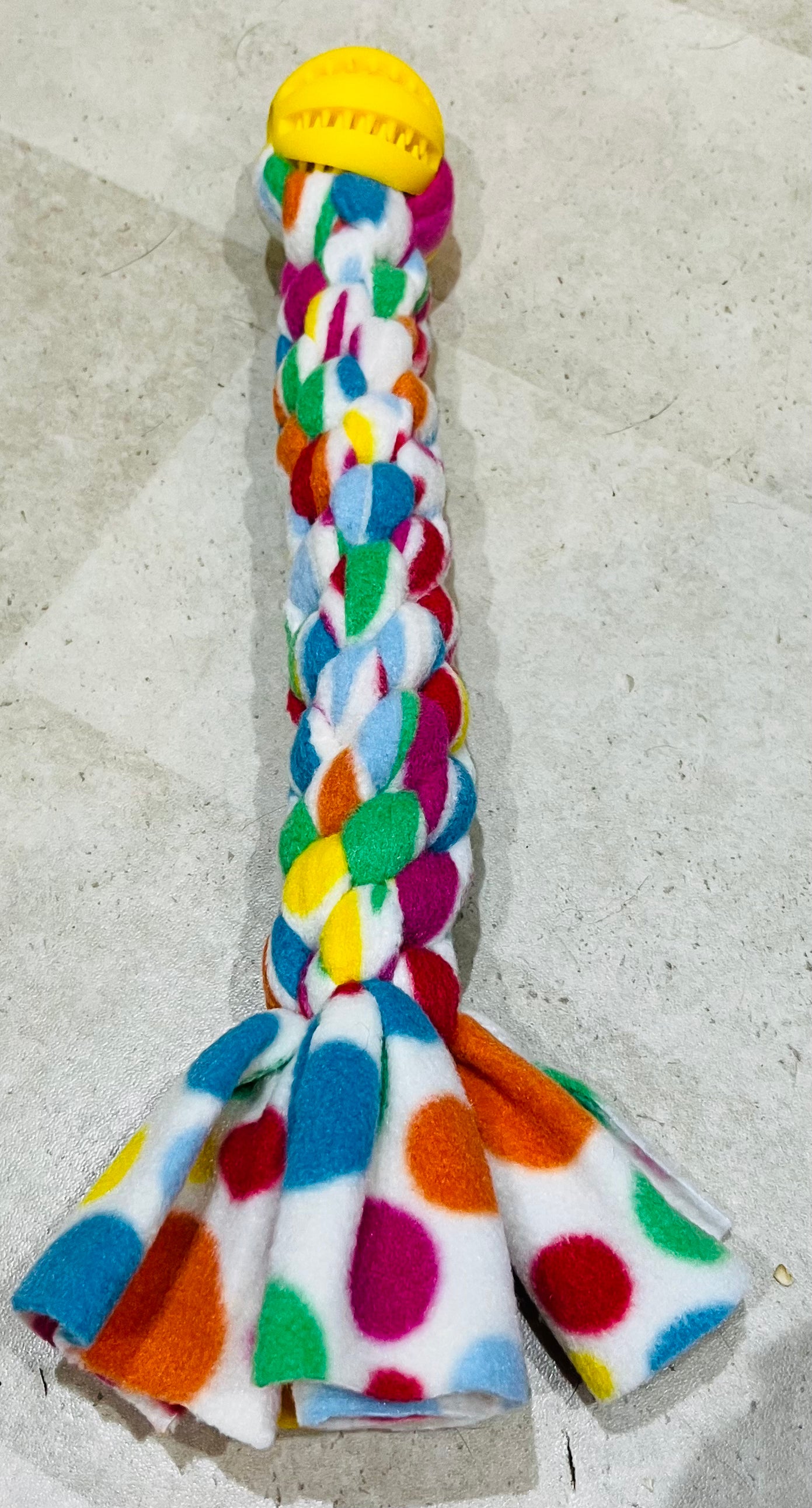 Ball & Tug - Approx 30cm in length . These are square knotted so are very robust and are finished with a treat dispensing ball. Ball colour will vary but it will compliment the fleece design.Â