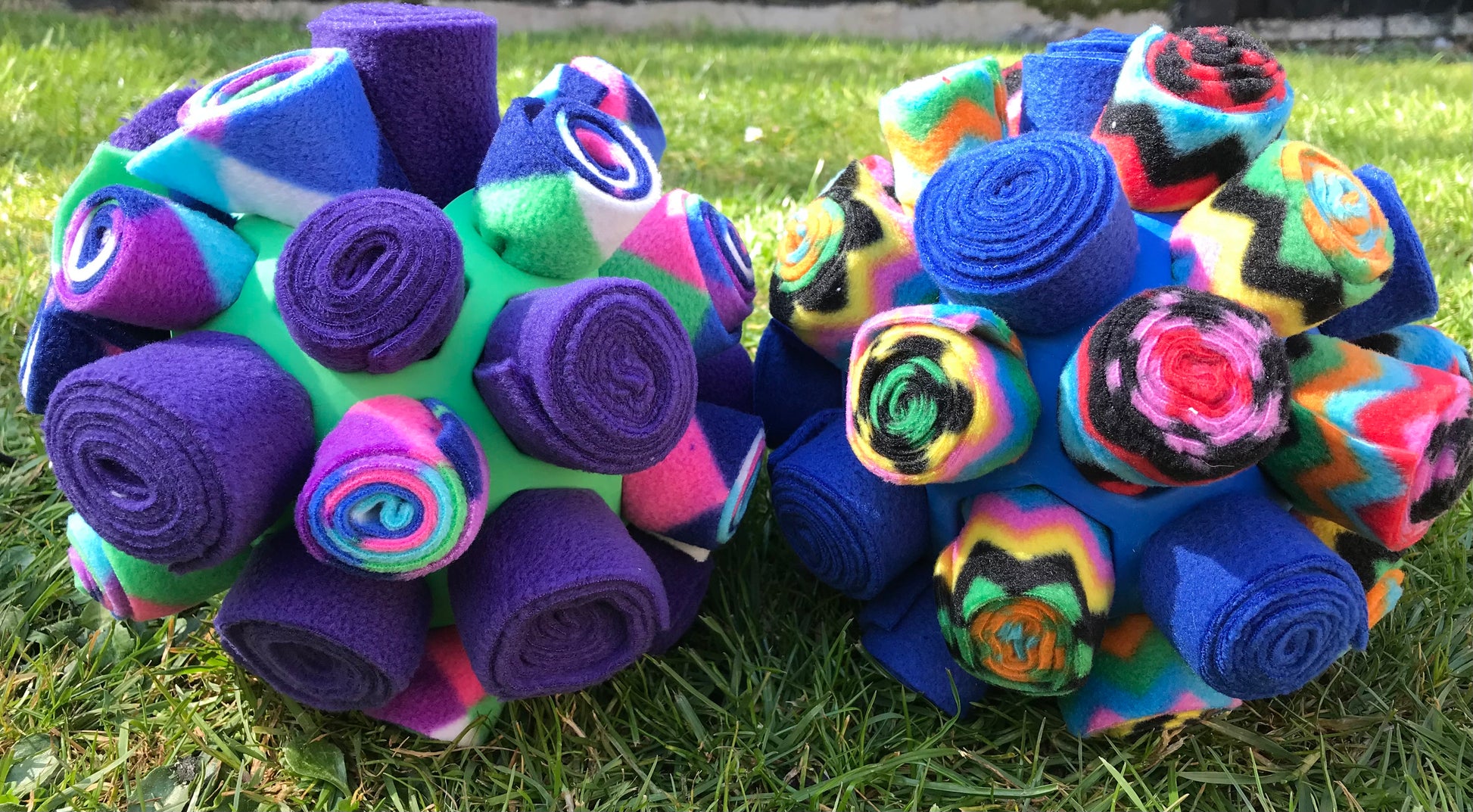 Simply roll the treat inside the fleece and pop them back into the cage ball. Your dog has to pull them out and unroll to retrieve the treat.